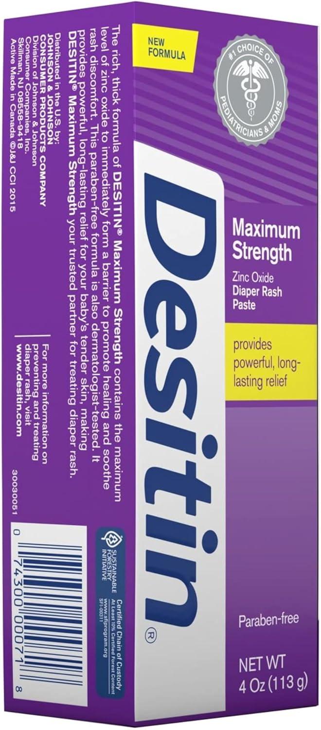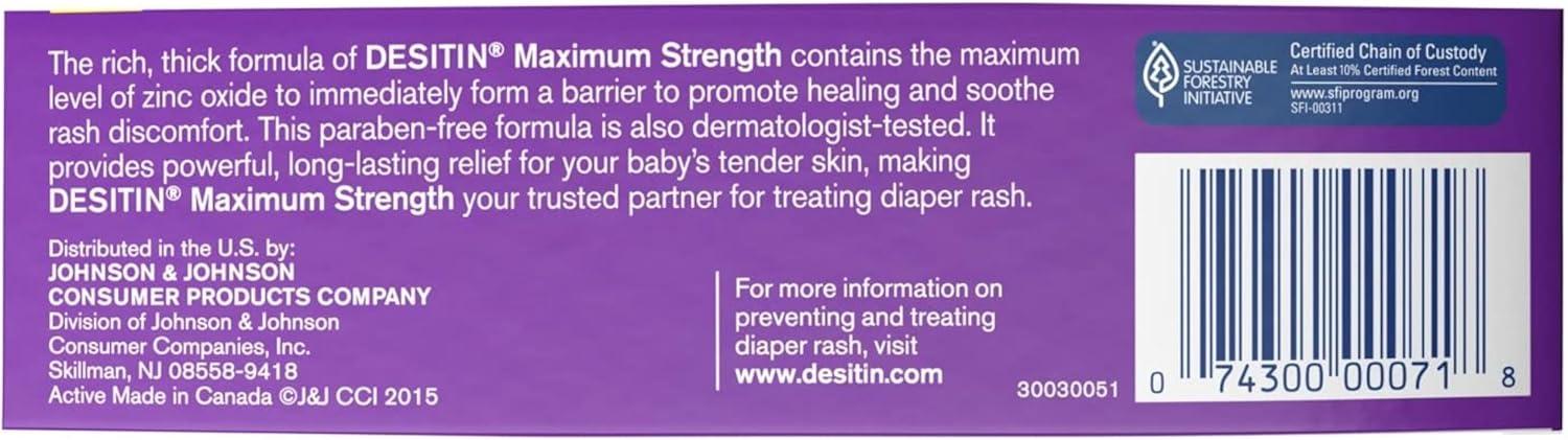 The #1 choice of pediatricians and parents, Desitin Maximum Strength Diaper Rash Paste works to effectively treat and help prevent diaper rash discomfort. Made with 40% maximum-level zinc oxide, this rich, thick diaper rash cream soothes and relieves on contact by sealing out wetness and protecting chafed skin due to diaper rash. Dermatologist- and pediatrician-tested, it is clinically shown to protect baby's delicate skin for 12 hours. The hypoallergenic formula of this diaper rash treatment is gentle enough for daily use and is free of parabens, phthalates, dyes, and soap. Desitin Maximum Strength Diaper Rash Paste provides 5-in-1 action to treat, heal, protect, soothe and prevent diaper rash, for healing you can see and relief your baby can feel.